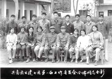 第一届共青团工作委员会,15 位委员中就有7 人是北京知青。他们是前排左起:艾建英、戚玲、甘奉原、杨百瑾 后排:杨开明(左一)、罗威(左四)、李爱国(左五)